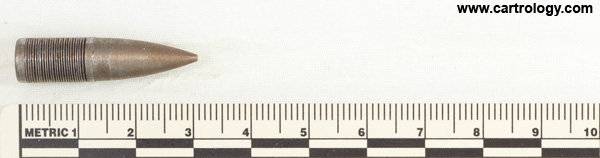 From .30 Light Rifle/7.62mm NATO development. Steel projectile with zinc plating, before sizing.